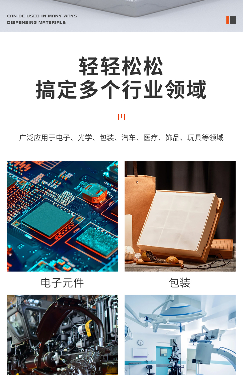 不管您是從事水性液體或濃稠膏狀流體的點膠作業(yè),本控制器都可以大幅度降低您的作業(yè)成本,提高您的產(chǎn)品品質(zhì)、效率以及減少您的流體用量,廣泛應(yīng)用于電子、光學、包裝、汽車、醫(yī)療、飾品、玩具等領(lǐng)域。