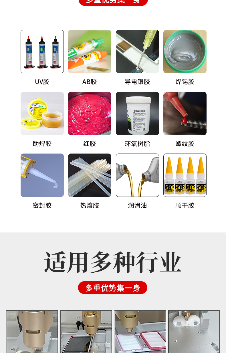9. 適用于各式需求點(diǎn)膠產(chǎn)業(yè),如:一般常見的 UV 膠、硅膠、silicon、紅膠、COB 黑膠、導(dǎo)電膠、錫膏等點(diǎn)膠,皆可使用再 D 系列設(shè)備上。